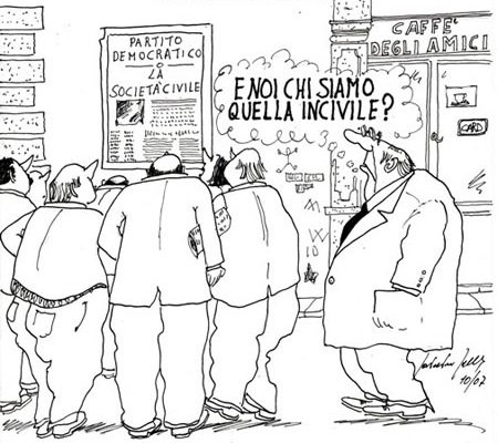 “ La società “. La società civile è un'aggregazione di cittadini riferita alla loro convivenza in uno Stato. L'aggettivo "civile", contrapposto a barbaro, sottintende il raggiungimento di un alto grado di civiltà materiale o spirituale. Il termine "civile" deriva dal latino civilis, derivato di civis (cittadino). (wikipedia; ndr). Come ciascuno capace di pensare può da sé arguire quando parliamo di società italiana parliamo di qualcosa di puramente teorico che non esiste nella realtà quotidiana. Per quanto ogni singolo caso di eccezione possa vantarsi di essere diverso e di elevarsi sugli altri se i pur tanti “ Ginostrada” esistenti non uniscono le loro forze ed i loro sforzi in un solo ambito comune atteso ad una vittoria finale sull’inciucio, l’intrallazzo, il malaffare, l’abuso ed il sopruso, la prevaricazione e la sottomissione del più debole, la discriminazione ovunque e comunque fosse, la “merdosità avvertita e quella reale” continueranno in eterno ad indentificare come caratteristica peculiare l’esistenza di ognuno di noi.